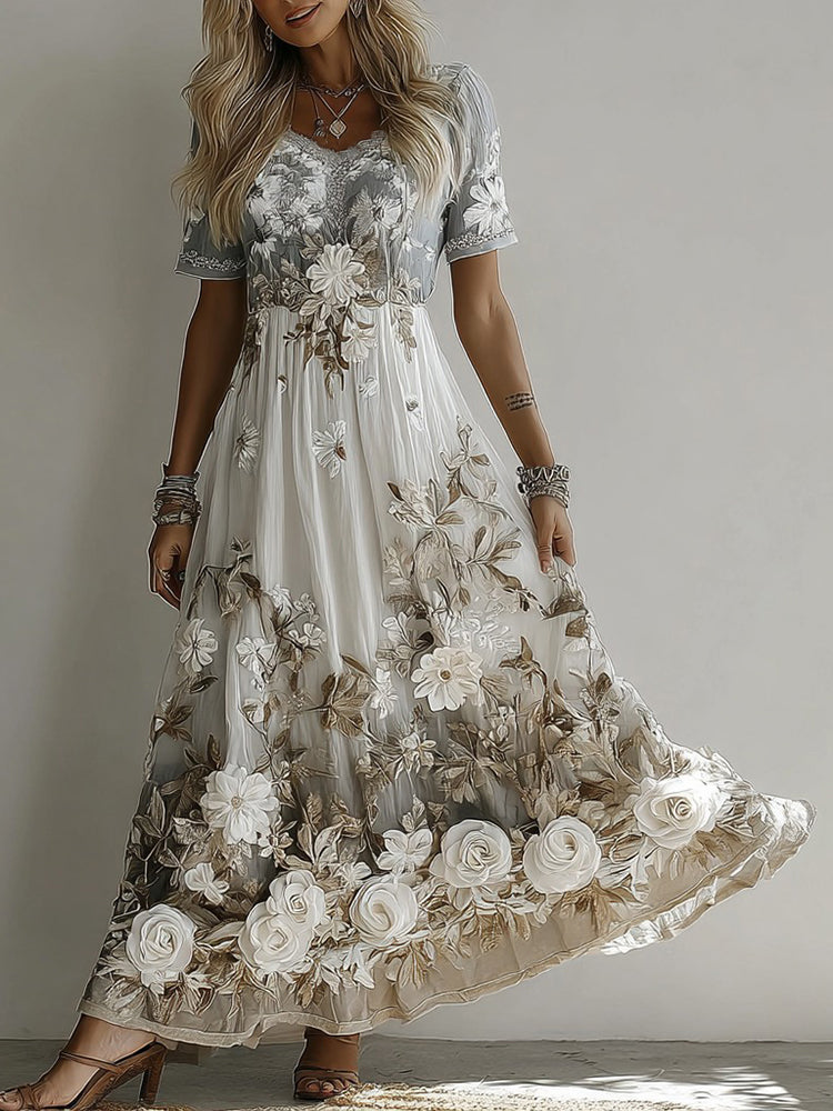 Vestido largo de manga corta con cuello redondo y bordado de rosas retro para mujer