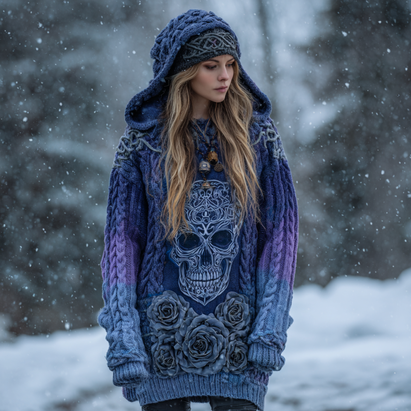 Suéter con capucha de punto grueso para mujer, estilo vikingo tribal jacquard celta con rosas y calaveras