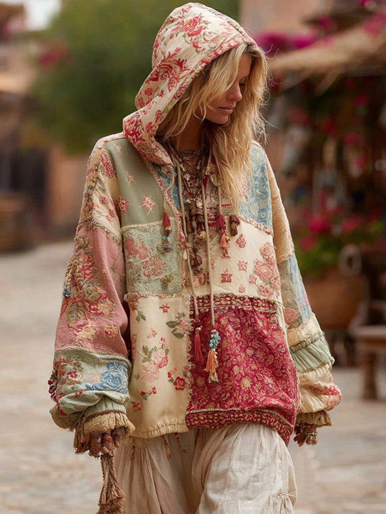 Sudadera con capucha informal estilo boho con bordado floral y patchwork para mujer