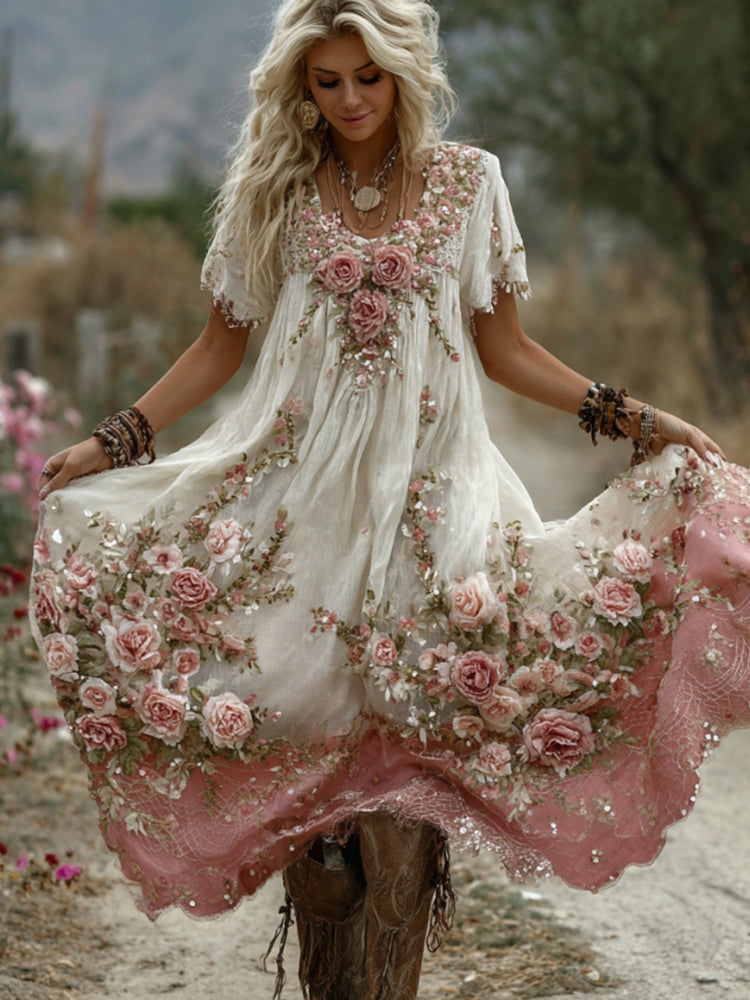Robe midi à manches courtes en lin mélangé à broderies florales roses pour femme